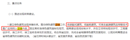 在重點(diǎn)任務(wù)中,提出推進(jìn)法規(guī)政策建設(shè):推動(dòng)綠色建筑立法工作,將裝配式建筑、可再生能源應(yīng)用等技術(shù)推廣應(yīng)用納入立法內(nèi)容。
