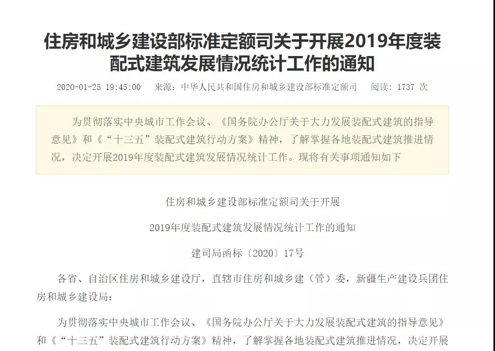 2020年1月25日,住房和城鄉(xiāng)建設(shè)部標(biāo)準(zhǔn)定額司關(guān)于開展2019年度裝配式建筑發(fā)展情況統(tǒng)計(jì)工作的通知,內(nèi)容強(qiáng)調(diào):